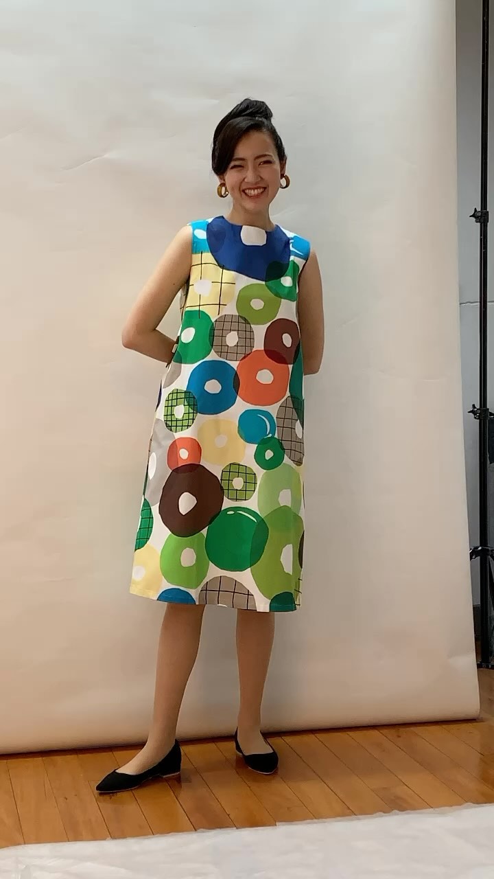ジャクリーンのレトロワンピースの多くは、大きな柄で明るく発色の良いテキスタイルを使用し、膝丈サイズで表現しています。